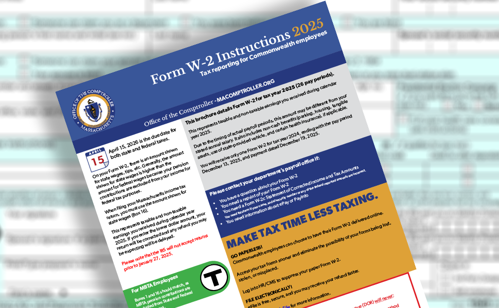 The Form W-2 represents taxable and non-taxable earnings you received as an employee of the Commonwealth of Massachusetts during calendar year 2023. This includes employees of higher education, the Massachusetts Bay Transit Authority (MBTA), and the Massachusetts School Building Authority (MSBA).